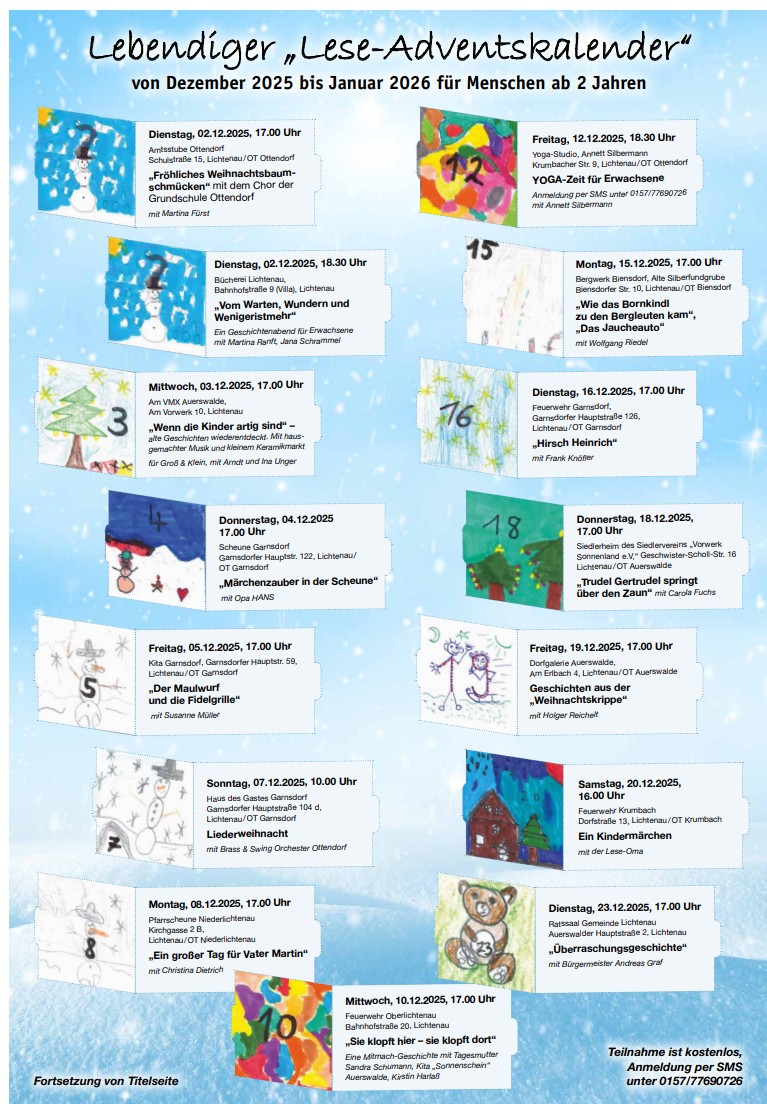 Die Teilnehmer erwartet ein kleines Programm der Ottendorfer Grundschüler und im Anschluss werden Carla und Michael (ehemalige Mitglieder der Gruppe „Die Schäfer“) musikalisch für weihnachtliche und hoffentlich gute, stimmungsvolle Unterhaltung sorgen.